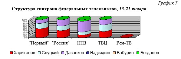 Л. Слуцкий получил наибольшую долю синхрона на ТВЦ (36%). Предпочтение А. Нечаеву отдал НТВ (61%). Б. Надеждин и С. Бабурин не получили время для выступления. А. Богданов выступил только на НТВ (8%) (График 7).