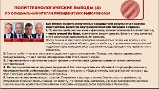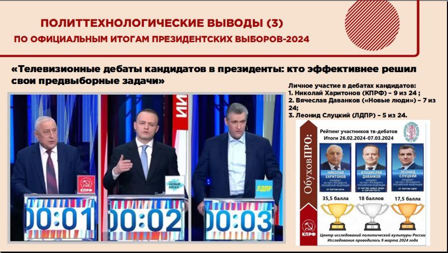 3. «Телевизионные дебаты кандидатов в президенты: кто эффективнее решил свои предвыборные задачи». В условиях традиционного неучастия Путина в дебатах наиболее активным был кандидат КПРФ Н.М.Харитонов.