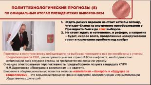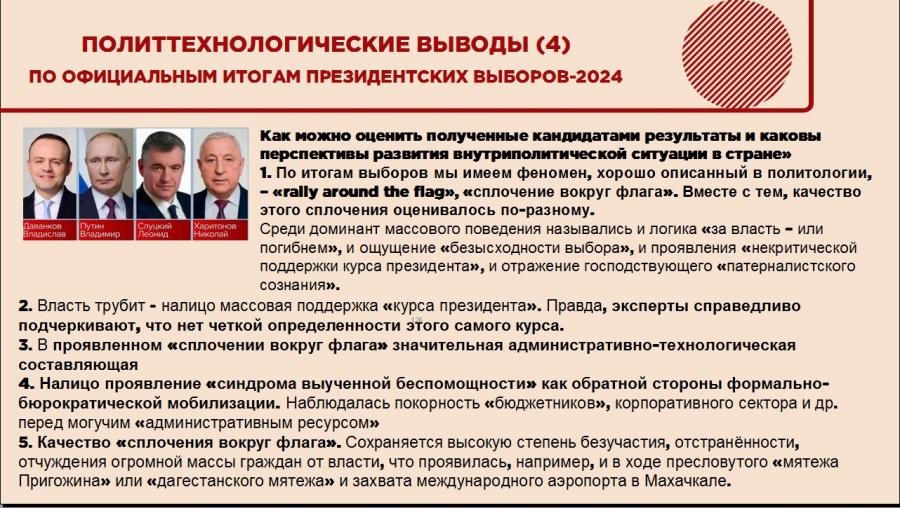 СВО накладывало решающий отпечаток на ход выборной кампании в марте 2024 г., которая, по сути, превратилась в референдум по поддержке Верховного главнокомандующего.