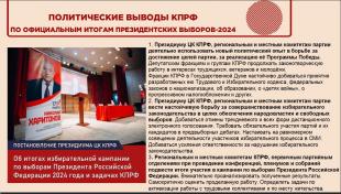 - Президентские выборы в 2024 году впервые проводились в условиях жестокой войны,-отметил С.П.Обухов, - которая объявлена Русскому Миру. КПРФ использовала президентские выборы, чтобы посеять в российском обществе ключевые идеи и альтернативные предложения, которые обязательно будут востребованы, прорастут в массовом сознании и определят государственную политику, направленную на преодоление всех современных вызовов, стоящих перед Российской Федерацией.
