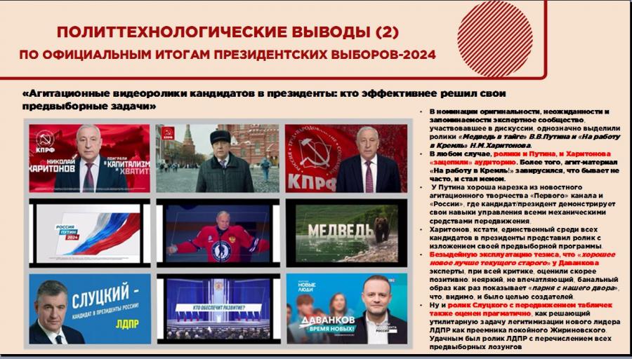 2. «Агитационные видеоролики кандидатов в президенты: кто эффективнее решил свои предвыборные задачи». В номинации оригинальности, неожиданности и запоминаемости экспертное сообщество, участвовавшее в дискуссии, однозначно выделили ролики «Медведь в тайге» В.В.Путина и «На работу в Кремль» Н.М.Харитонова.