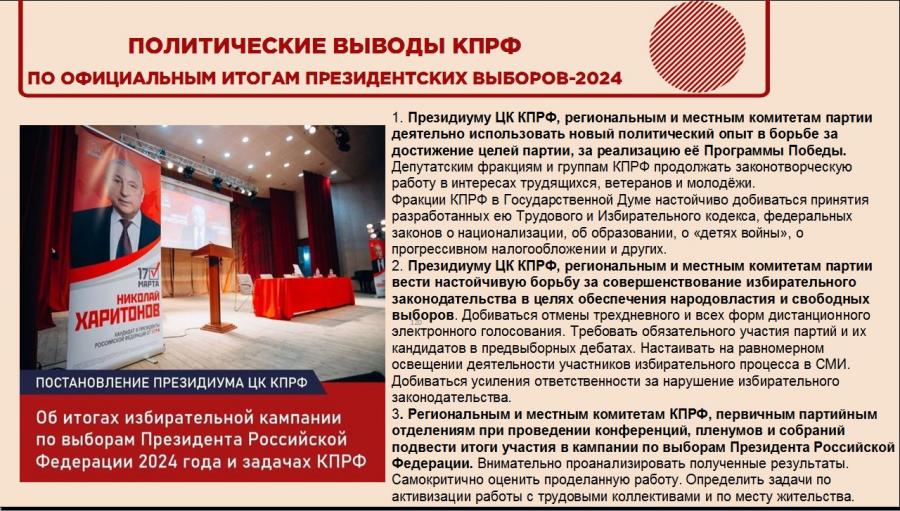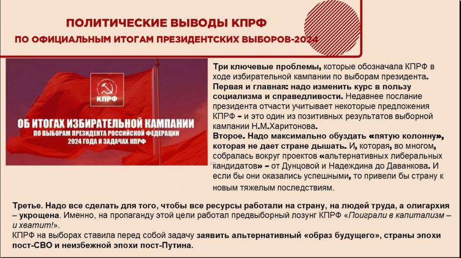 - Первая и главная: надо изменить курс в пользу социализма и справедливости. Недавнее послание президента отчасти учитывает некоторые предложения КПРФ – и это один из позитивных результатов выборной кампании Н.М.Харитонова.