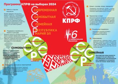 В Марий Эл, где мы более всего рассчитываем на успех пропаганда идет под лозунгом СССР – современность, семья, самобытность, республика Марий Эл. Здесь пример очевиден – голосуй за КПРФ и вся республика по развитию и социальной защищенности станет как совхоз «Звениговский» - образцовое народное предприятие.