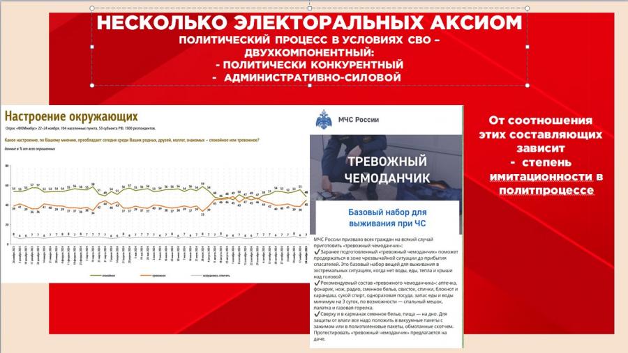 И именно от соотношения этих составляющих зависит степень «имитационности», «декоративности» в политических процессах. В период СВО, апатии вызванной повышенной тревожностью и общественным неврозом, растет роль административно-силовой составляющей в политпроцессе.