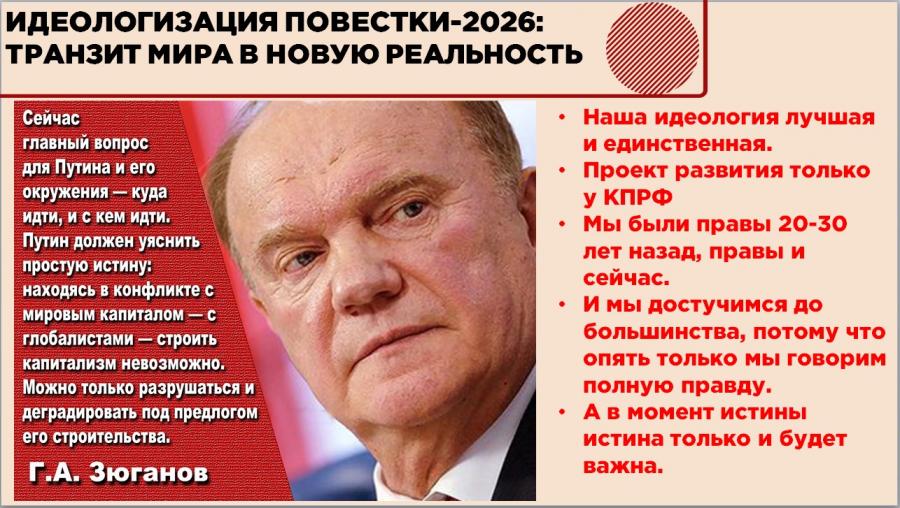 Именно поэтому лидер КПРФ Г.А.Зюганов идет дальше Путина в постановке идеологических проблем и заостряет: «Нам нужна ПОБЕДА. В противном случае – поражение. Для государства и страны поражение – это развал. Этого и добиваются англо-саксы». А потом еще: «Сейчас главный вопрос для Путина и его окружения – куда идти и с кем идти. Путин должен уяснить простую истину: находясь в конфликте с мировым капиталом – с глобалистами – строить капитализм невозможно. Можно только разрушаться и деградировать под предлогом его строительства».