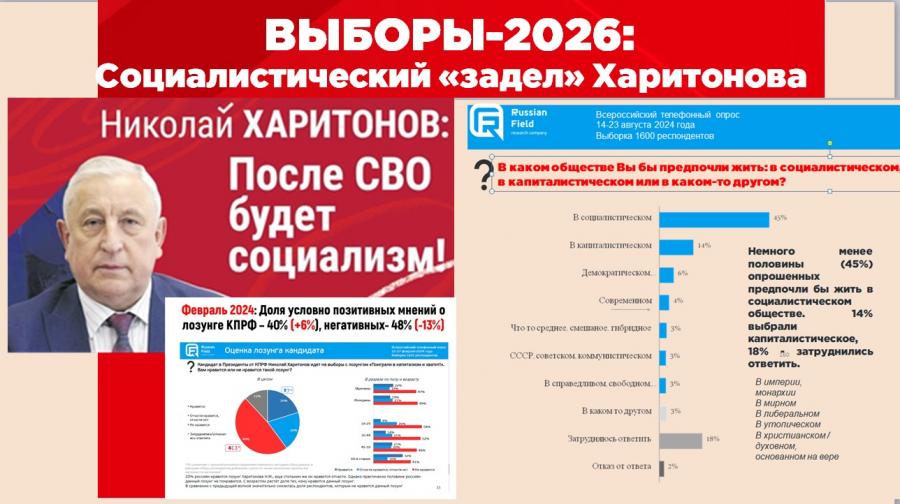 3. На выборах президента России в 2024 году кандидат-коммунист Николай Харитонов прямо заявил, что после СВО будет социализм! Этот лозунг в той или иной степени одобрило 40% россиян. И свежие социологические исследования (Russian Field подтвердили: 45% россиян хотят жить в социалистическом государстве, а остаться в капиталистическом хотят немногим менее 15% (позиции остальных – ближе к неопределившимся по базовому водоразделу).