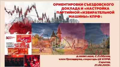 6.Подготовка к выборам в Госдуму 2026 года. В съездовском докладе даны «конкретные поручения по подготовке к выборам 2026 года…», например, фракции КПРФ в Госдуме. Особо отмечено, что «…все наши лучшие силы должны включиться в подготовку к выборам в Государственную думу». По сути, объявлена мобилизация партии на федеральную избирательную кампанию, подчеркнул Сергей Обухов.