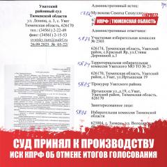 КПРФ обратилась в Уватский районный суд с исковым заявлением о признании незаконным и об отмене итогов голосования по данному избирательному участку. Также обращения направлены в полицию и следственный комитет.