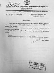 О своём отказе участвовать в иске руководитель Избирательной комиссии Тюменской области в письменной форме уведомил Уватский районный суд. Ссылаясь на занятость по основному месту работы, Халин попросил рассмотреть дело в его отсутствие. Чем именно занят председатель облизбиркома в период между выборами и почему он не направил представителя по доверенности, в письме не сообщается. Ранее суд привлёк облизбирком к иску в качестве заинтересованного лица.