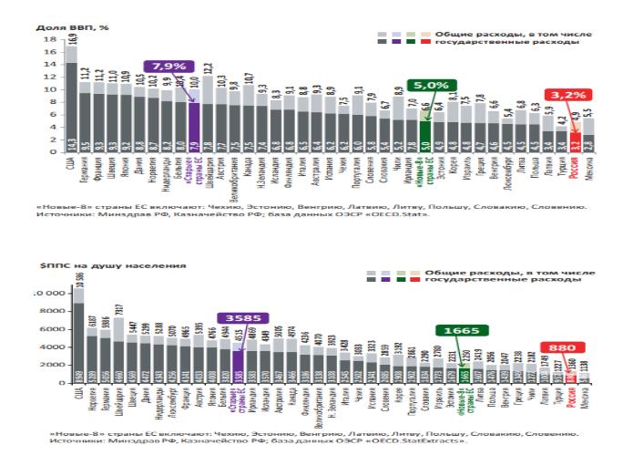 При этом в РФ долгие годы общее государственное финансирование здравоохранения было минимум в 1,5-2 раза ниже по отношению к ВВП, чем аналогичные расходы в странах ЕС.