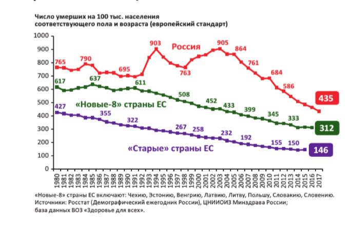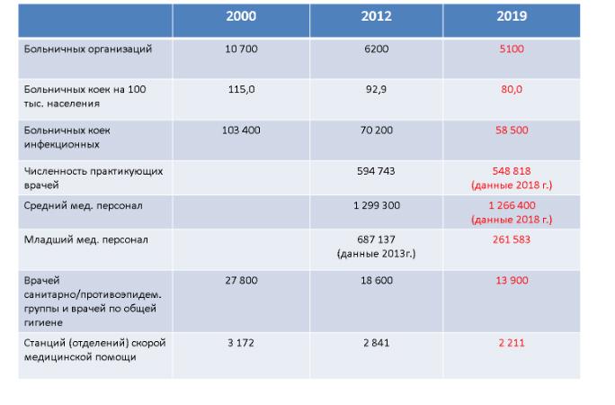 В результате оптимизации количество больничных организаций в России было сокращено в сравнении с 2000 годом более, чем вдвое, круглосуточных коек на 30%, а инфекционных коек более чем на 40%. Наблюдалось и снижение количества медицинских специалистов. Показатели смертности граждан в трудоспособном возрасте у мужчин в РФ на 2018 год были выше в 2.8 раза, а у женщин в 2.1 раза, чем в странах ЕС.