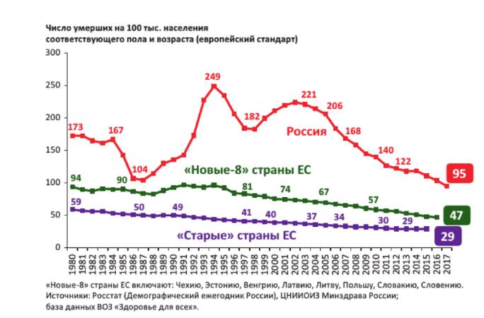 Коэффициент смертности от ССЗ, внешних причин, более, чем в 2 разапревышал показатели в странах ЕС.