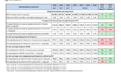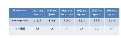 В 2022 г. по сравнению с 2021 г. по прогнозу государственные расходы на здравоохранение в текущих ценах возрастут только на 3% (127 млрд. руб.), в постоянных ценах (с поправкой на инфляцию, 2012 =100%) они сократятся на 1%. За этот же период сократится и доля государственного финансирования в ВВП - с 4,1% до 3,9%. В 2024 г. по сравнению с 2021 г. государственные расходы в текущих ценах возрастут на 12%, в постоянных ценах сократятся на 1%. За этот же период сократится и доля государственного финансирования в ВВП - с 4,1% до 3,7%. При этом минимально необходимая величина государственного