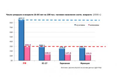В результате оптимизации количество больничных организаций в России было сокращено в сравнении с 2000 годом более, чем вдвое, круглосуточных коек на 30%, а инфекционных коек более чем на 40%. Наблюдалось и снижение количества медицинских специалистов. Показатели смертности граждан в трудоспособном возрасте у мужчин в РФ на 2018 год были выше в 2.8 раза, а у женщин в 2.1 раза, чем в странах ЕС.