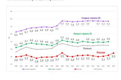 При этом в РФ долгие годы общее государственное финансирование здравоохранения было минимум в 1,5-2 раза ниже по отношению к ВВП, чем аналогичные расходы в странах ЕС.