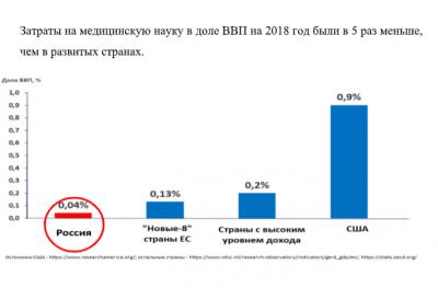Затраты на медицинскую науку в доле ВВП на 2018 год были в 5 раз меньше, чем в развитых странах.