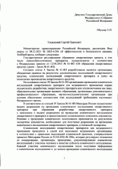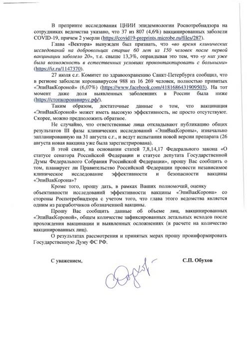 Обозначенные факты о возможном «конфликте интересов» при принятии решения о целесообразности применения вакцины также стали предметом депутатского запроса С.П. Обухова в адрес Правительства Российской Федерации.