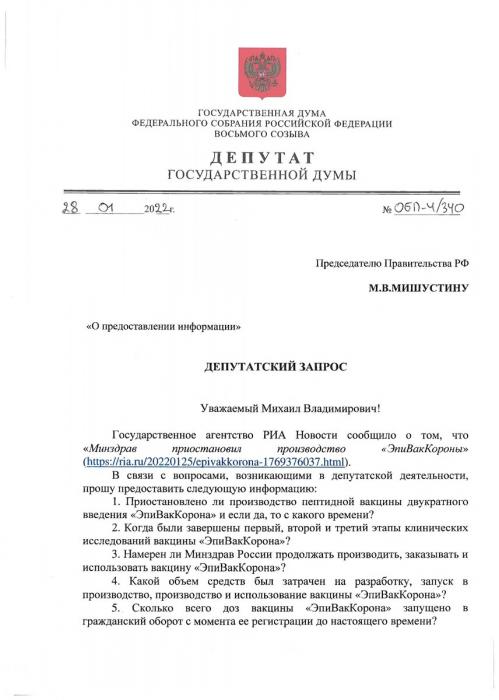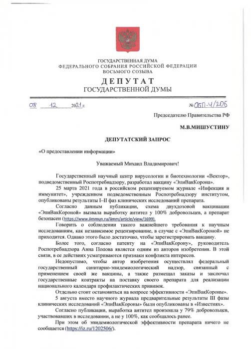 Депутатские запросы на тему «конфликта интересов» и эффективности «ЭпиВакКороны».