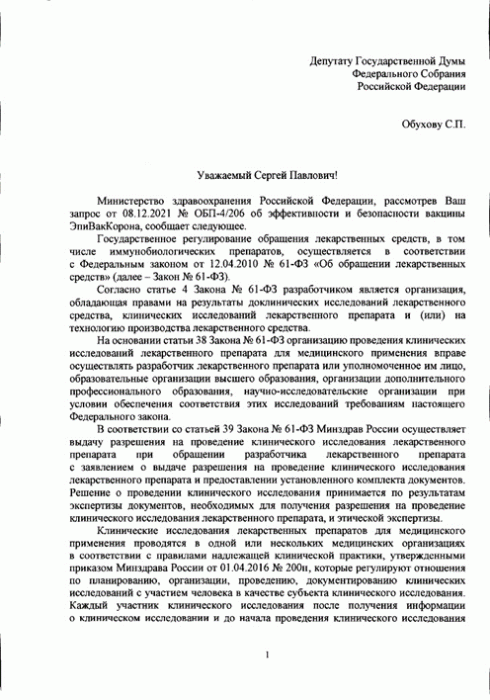 Ответы на депутатские запросы С.П.Обухова о сроках завершения вакцинных испытаний