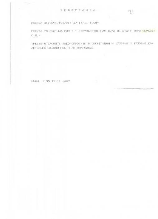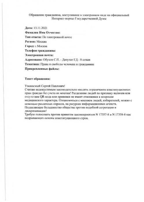 Получая огромный поток писем от возмущенных москвичей, координатор «Народной приемной» КПРФ в ВАО депутат Государственной Думы С.П. Обухов принял активное участие в кампании против сегрегационных законопроектов и написал несколько десятков депутатских запросов в государственные органы. Лейтмотив всех этих обращений – вакцинация должна носить исключительно добровольный характер!