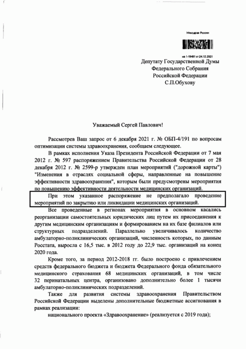 Оптимизация не предполагала закрытие медучреждений. Видимо, они закрылись сами. Ответ Минздрава на деп. запрос С.П. Обухова с требованием пересмотреть политику «оптимизации».