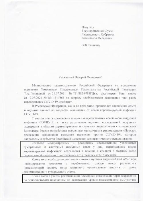Согласно рекомендациям Всемирной организации здравоохранения важно своевременно вакцинироваться вне зависимости от наличия и количества антител», - сообщается в ответе вице-премьера на депутатские запросы "Народной приемной" .