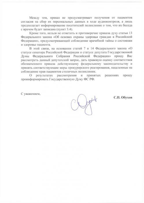 В своем обращении к Генеральному прокурору и в Минюст я также поинтересовался, а была ли проведена правовая экспертиза скандального московского приказа на соответствие федеральному и антикоррупционному законодательству. В любом случае настаиваю на публичном обсуждении федеральными ведомствами законности приказов о «прослушке» в поликлиниках.