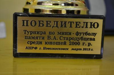 7 марта в г.Новомосковске проходил II традиционный турнир по мини-футболу памяти губернатора Тульской области, Героя Социалистического Труда В.А. Стародубцева среди подростков 2000-2001 годов рождения. В межрегиональном турнире принимали участие шесть команд из Тульской, Рязанской и Московской областей. Команда МФК КПРФ, представляющая г. Новомосковск, выиграв все свои игры без особых усилий вышли в финальный турнир.