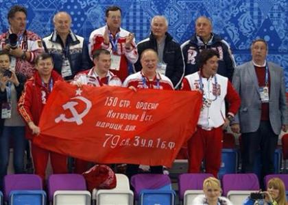 Знамя является копией флага, поднятого советскими солдатами в Берлине в 1945 году в знак победы над нацистской Германией. Международный Олимпийский Комитет запрещает демонстрацию политических флагов на олимпийских мероприятиях. (AP Photo/Vadim Ghirda)