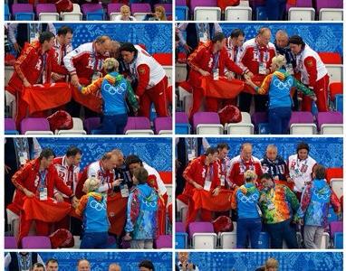 На этой серии фотографий, сделанных в пятницу 21 февраля 2014 года в конькобежном дворце «Айсберг» в Сочи, Россия, группа представителей Коммунистической партии пытается продемонстрировать советское Знамя Победы во время цветочной церемонии на соревновании конькобежцев по шорт-треку на зимних Олимпийских Играх 2014 года.