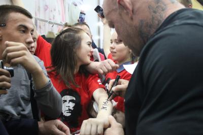 время церемонии взвешивания бойцов, собралась большой группой поддержки. После