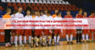 В субботу, 11 июня, Председатель ЦК КПРФ Г.А. Зюганов принял участие в церемонии открытия Всероссийского турнира по мини-футболу «Таланты России», организованного Спортклубом КПРФ. В мероприятии также приняли участие первый заместитель Председателя ЦК КПРФ И.И. Мельников, секретарь ЦК КПРФ Ю.В. Афонин, руководитель Спортивного клуба КПРФ Иван Мельников (младший).