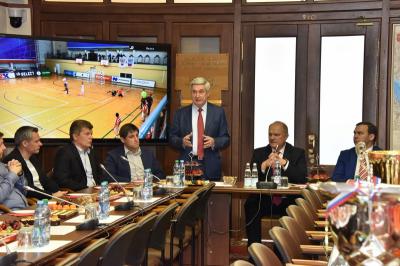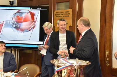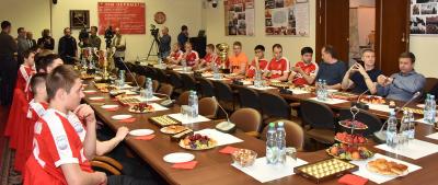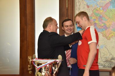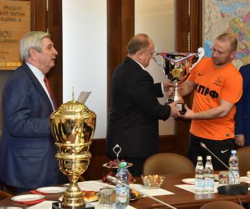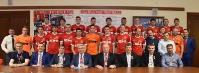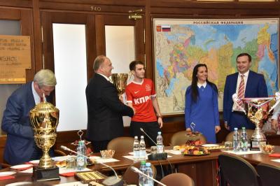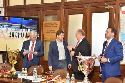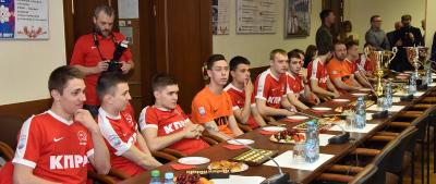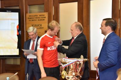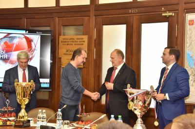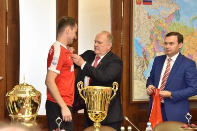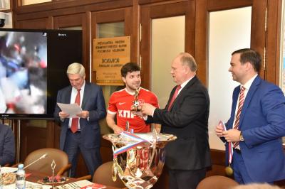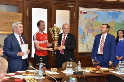 19 мая, в пятницу, в холле фракции КПРФ в Государственной Думе состоялся торжественный прием от имени Председателя ЦК КПРФ и руководителя фракции КПРФ Геннадия Зюганова в честь спортсменов молодежной команды КПРФ по мини-футболу - чемпионов Высшей лиги Первенства России 2016/2017 годов.
