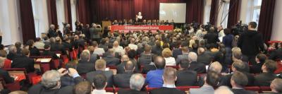 Г.А. Зюганов рассказал, что сегодня капитал становится все агрессивнее, он ищет выход из кризиса на пути военных авантюр. Коммунисты же предлагают свою антикризисную программу, в основе которой национализация стратегических отраслей, регулирование тарифов, бесплатное образование и здравоохранение. Цель сегодняшнего съезда трудящихся – обсудить антикризисные предложения Компартии.