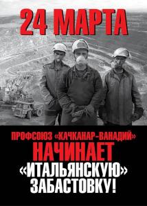 24 марта на предприятии ОАО «ЕВРАЗ КГОК» профсоюзом «Качканар-Ванадий» объявлена забастовка. В организации забастовки профсоюзу активно помогает руководство Свердловского областного отделения КПРФ. Предварительно прошел ряд встреч, на которых председатель профсоюза А.А. Пьянков, первый секретарь обкома КПРФ А.Н. Ивачев и депутат качканарской думы фракции КПРФ Г.Ф. Даутов (сотрудник комбината) обсудили подготовку рабочих предприятия к акции. Было принято решение провести «итальянскую» забастовку.