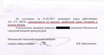 В ответе, полученном от Московской городской военной прокуратуры, сообщается, что « у Общества образовалась задолженность по выплате заработной платы перед работниками ». В этой связи Московской городской военной прокуратурой было внесено представление об устранении нарушений закона, реализация которого была взята на контроль. В рамках реализации указанного документа прокурорского реагирования руководством АО «ГУ ЖКХ» во взаимодействии с Департаментом эксплуатационного содержания и обеспечения коммунальными услугами воинских частей и организаций Минобороны России приняты меры к погашению указанной задолженности по заработной плате.