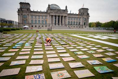 Подготовка к акции в защиту климата в Берлине, Германия. Активисты экологического движения Fridays for Future для участия в демонстрации передали самодельные плакаты, чтобы разложить их у бундестага.