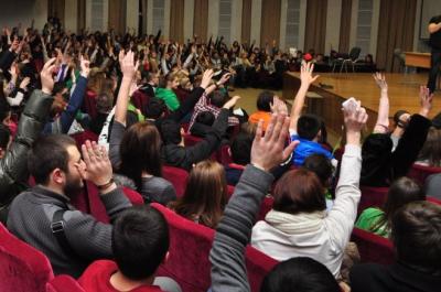 После того, как комсомольцы закончили отвечать на вопросы с трибуны, заинтересованные студенты обступили их коридоре у актового зала и продолжали задавать вопросы, общаться, интересоваться возможностями дальнейшего взаимодействия. Вместе с секретарями горкома комсомола на место прибыли активисты МГО ЛКСМ - депутат муниципального собрания Виталий Мальцев, и студенты Вадим Цыбанков и Екатерина Киречко. Они сразу же включились в работу студенческого собрания, стали распространять текст обращения о законе "Образование для всех". Активисты будут поддерживать забастовку личным участием всю ночь и завтрашнее утро.