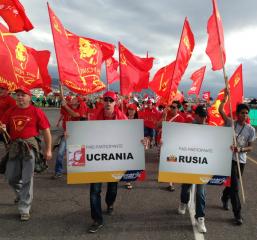 По настоящему дружескую атмосферу создавало и то, что колонна из Ленинского Комсомола Украины шла бок о бок со своими российскими товарищами. Украинских комсомольцев вел первый секретарь ЦК ЛКСМ Александр Присяжнюк. "Наша Родина - СССР" сменялся лозунгом "Зюганов, Симоненко, Победа!" и "Ленин, Партия, Комсомол!". Братания с борющейся Сирией, комсомольцами Эквадора, товарищами из КНДР, сотни реющих флагов, песни и кричалки под барабанную дробь наилучшим образом иллюстрировали дух фестиваля.