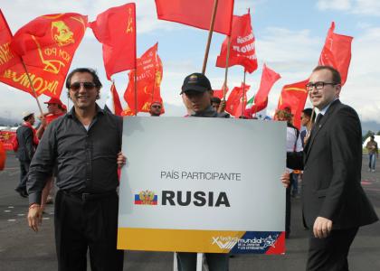 Колонну российской делегации возглавили секретари ЦК ЛКСМ РФ Анатолий Долгачев, Александр Ивачев, Ильгам Гаписов, Баир Цыренов и Ярослав Листов. Поприветствовать делегацию от России пришел Ян Анастасьевич Бурляй, Чрезвычайный и Полномочный Посол Российской Федерации в Республике Эквадор.