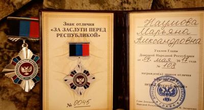 11 мая, на праздновании Дня Республики, Глава ДНР Александр Захарченко вручил Марьяне Наумовой орден «За заслуги перед республикой».