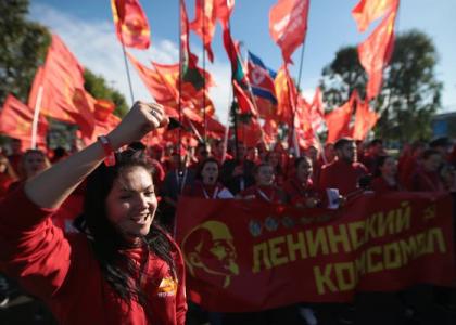 После митинга делегация ЛКСМ РФ отправилась на панельную дискуссию на тему: «100 лет Великой Октябрьской социалистической революции» в главном медиацентре. До места комсомольцы вновь шли организованной колонной: на ветру развевались красные флаги, звучали революционные кричалки.