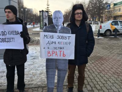Кроме того, к пикету присоединился еще один участник, удивительно похожий на упомянутого ранее Дмитрия Киселева. Неизвестный встал в ряды пикетчиков и признался, что работая в федеральных СМИ он устал врать!