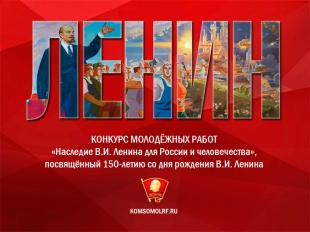 ЦК ЛКСМ РФ запускает конкурс научных статей, рефератов, эссе студентов ВУЗов, ССУЗов и старшеклассников «Наследие В.И. Ленина для России и человечества», посвящённый 150-летию со дня рождения В.И. Ленина.