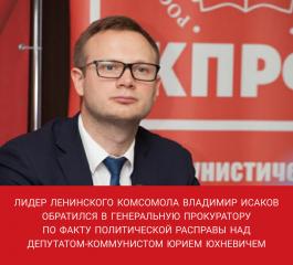 Первый секретарь ЦК ЛКСМ РФ Владимир Исаков направил письмо Генеральному прокурору Российской Федерации И.В. Краснову по факту политической расправы над депутатом Тюменской областной думы фракции КПРФ Юрием Юхневичем.