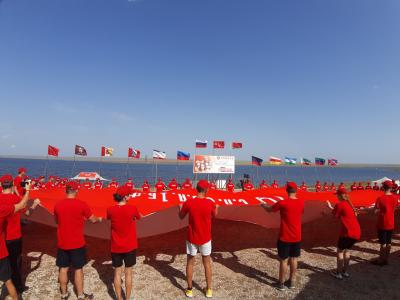 А затем курсанты, преподаватели и гости лагеря, следуя доброй традиции, под звуки марша развернули гигантскую копию Знамени Победы площадью 200 квадратных метров.