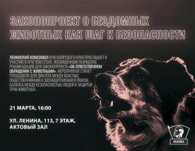 Мероприятие было организовано по инициативе первого секретаря Красноярского городского комитета ЛКСМ РФ Марка Пинегина, который открыл встречу с краткой информацией по законопроекту, отложенному в первом чтении в Государственной Думе. В конце февраля депутаты предложили на рассмотрение законопроект, который отменяет программу возврата бездомных собак на улицу после стерилизации и вакцинации и разрешает регионам усыплять бездомных животных после истечения установленного срока их содержания в приюте.