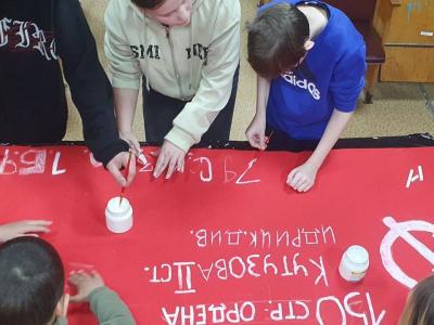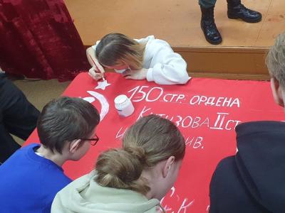 Завершился урок созданием копии Знамени Победы. Дети своими руками изготовили алый стяг, повторяющий легендарное знамя, водруженное над рейхстагом в 1945 году.