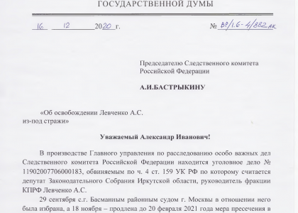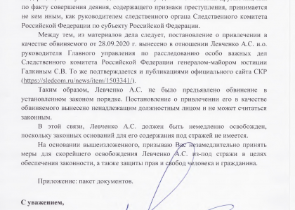 Также депутатский запрос (копия есть у VTimes) в Следственный комитет России направил депутат Госдумы Валерий Рашкин. Он отмечает, что обвинение Андрею Левченко не было предъявлено в установленном законом порядке. Постановление о привлечении его в качестве обвиняемого вынесено ненадлежащим должностным лицом и не может считаться законным.
