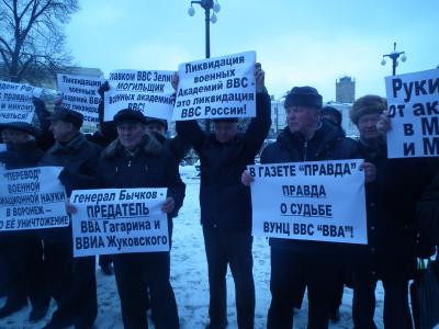 12 января в Москве на Гоголевском бульваре напротив Министерства обороны прошел пикет в защиту Военно-воздушных академий им. Жуковского и Гагарина. Акция, в которой приняли участие около ста офицеров, была организована при участии Московского отделения КПРФ, фракций КПРФ в Госдуме и Мосгордуме, а также Союза советских офицеров. Поддержать пикетчиков прибыли депутаты Госдумы Евгений Доровин и Вячеслав Тетекин, а также депутат Мосгордумы Владимир Святошенко. Участники акции протеста развернули плакаты: «Главком ВВС Зелин - могильщик академий ВВС!», «Ликвидация академий ВВС – это ликвидация ВВС!», «Премьер-министр: убери министра обороны Сердюкова!», «Главнокомандующего ВВС - в отставку!».